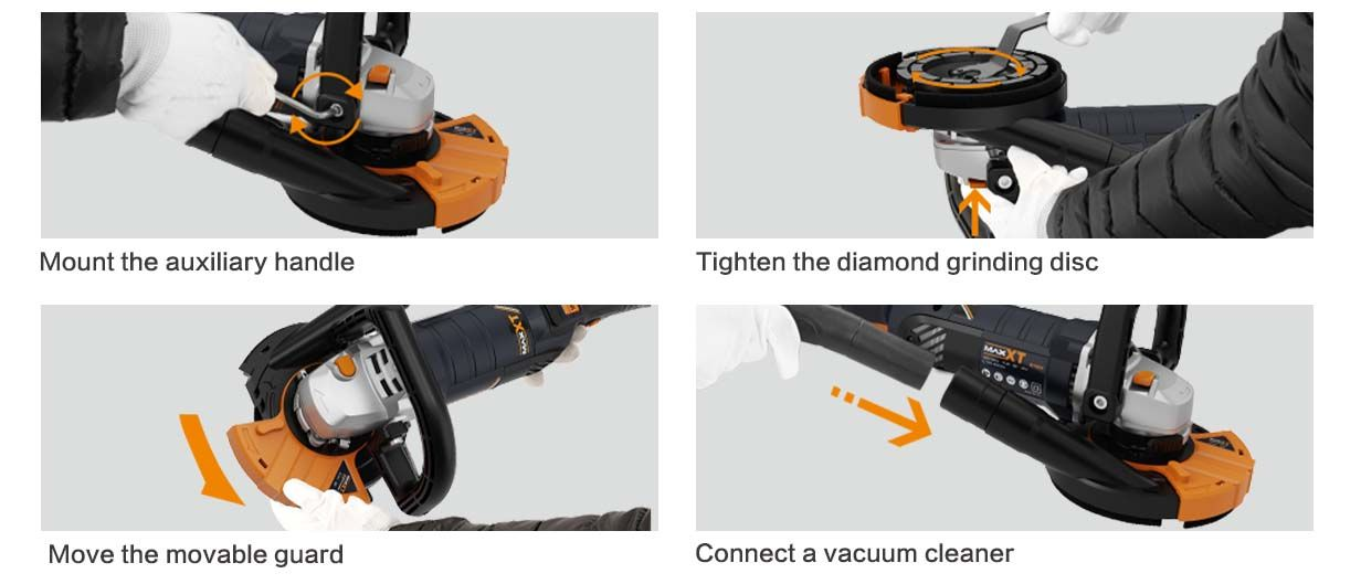 [Ergonomic Grip] : Equipped with a 125mm diamond grinding disc and a D-shaped anti-slip handle, it offers a comfortable and stable grip for effortless operation. A built-in safety lock prevents accidental activation, ensuring safer operation.
