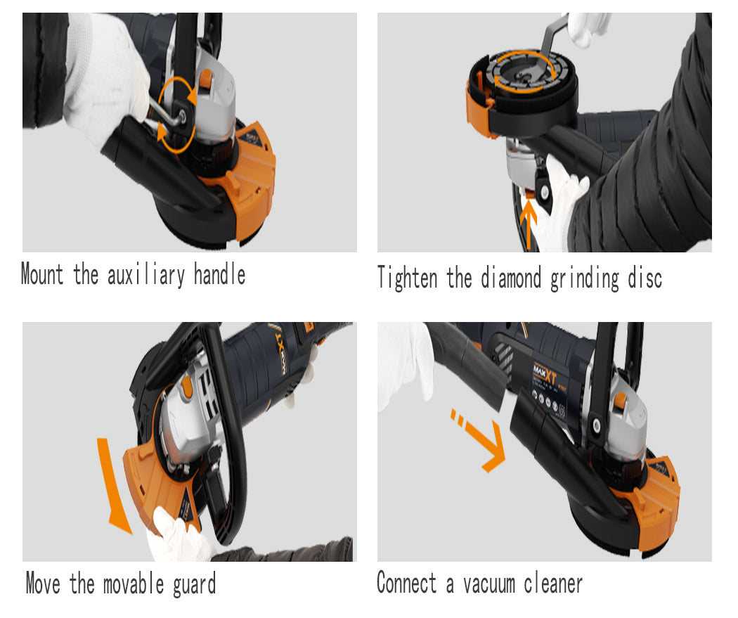 [Efficient Dust Collection System] : A standard dust collection port allows connection to an industrial vacuum cleaner for real-time dust collection. The compact body and adjustable dust cover maintain a clean working environment, meeting indoor construction requirements.