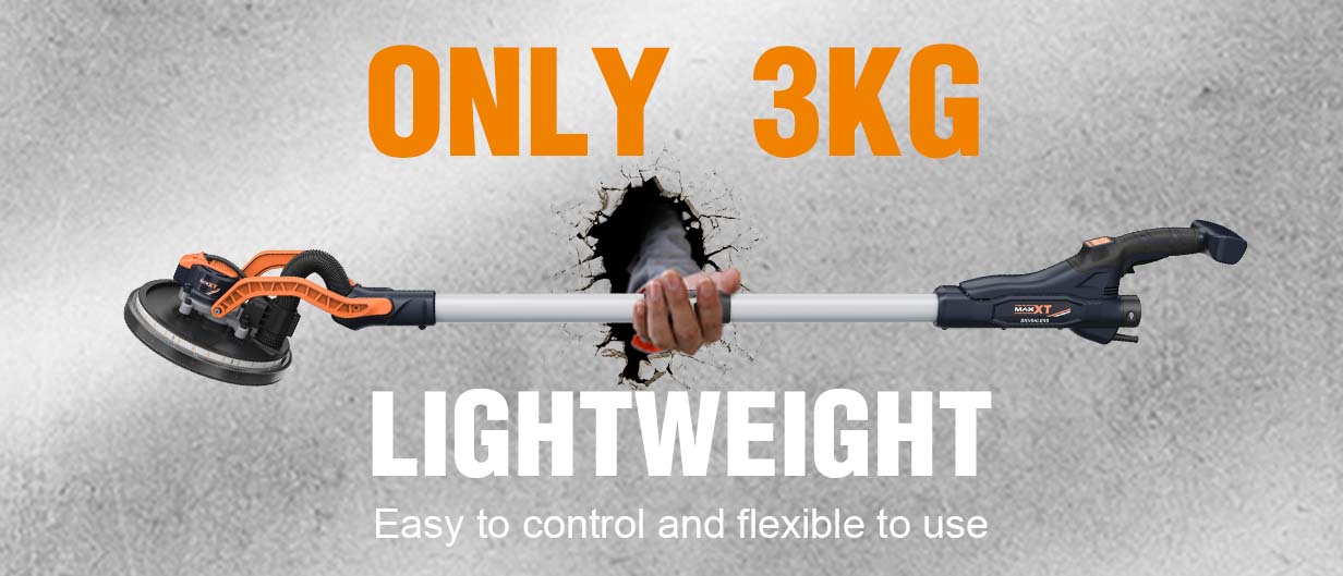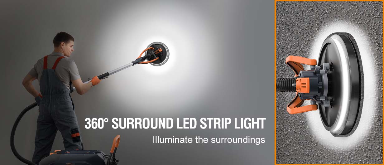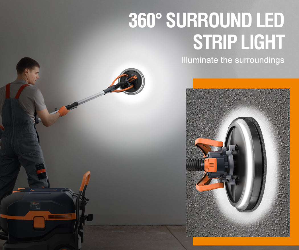[Multi-Angle Operation, Shadowless Lighting] :Built-in 360°环形 LED light evenly illuminates the work surface. The sanding head supports 150° multi-directional rotation, easily handling ceilings, walls, and corners. The sanding disc is partially detachable for easy access to corners and vertical surfaces.