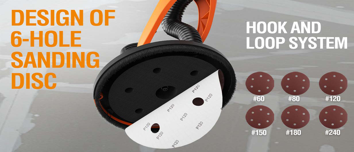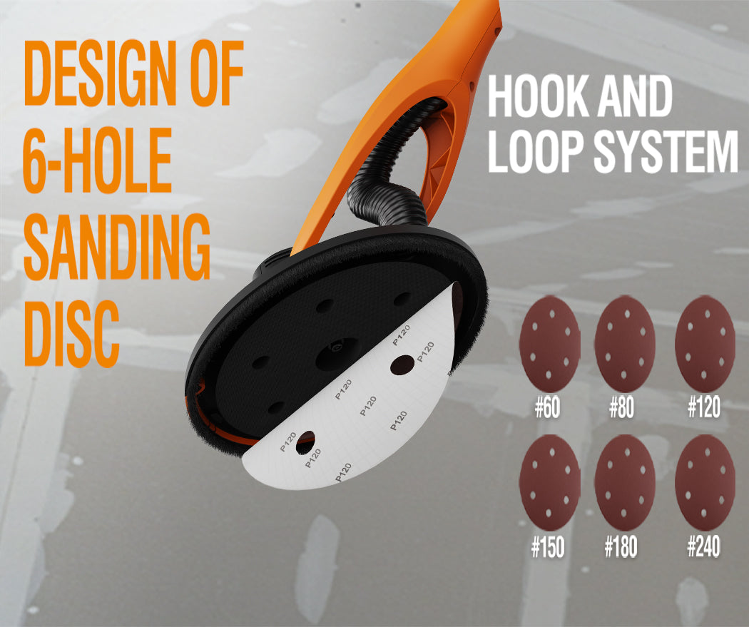 [Efficient Dust Removal System] :An enlarged fan increases suction by 30%, and the six-hole sanding disc enhances dust collection. When connected to a vacuum cleaner, it captures 95% of dust. The sealed dustproof switch protects the motor, making it suitable for dusty environments and ensuring long-lasting durability.