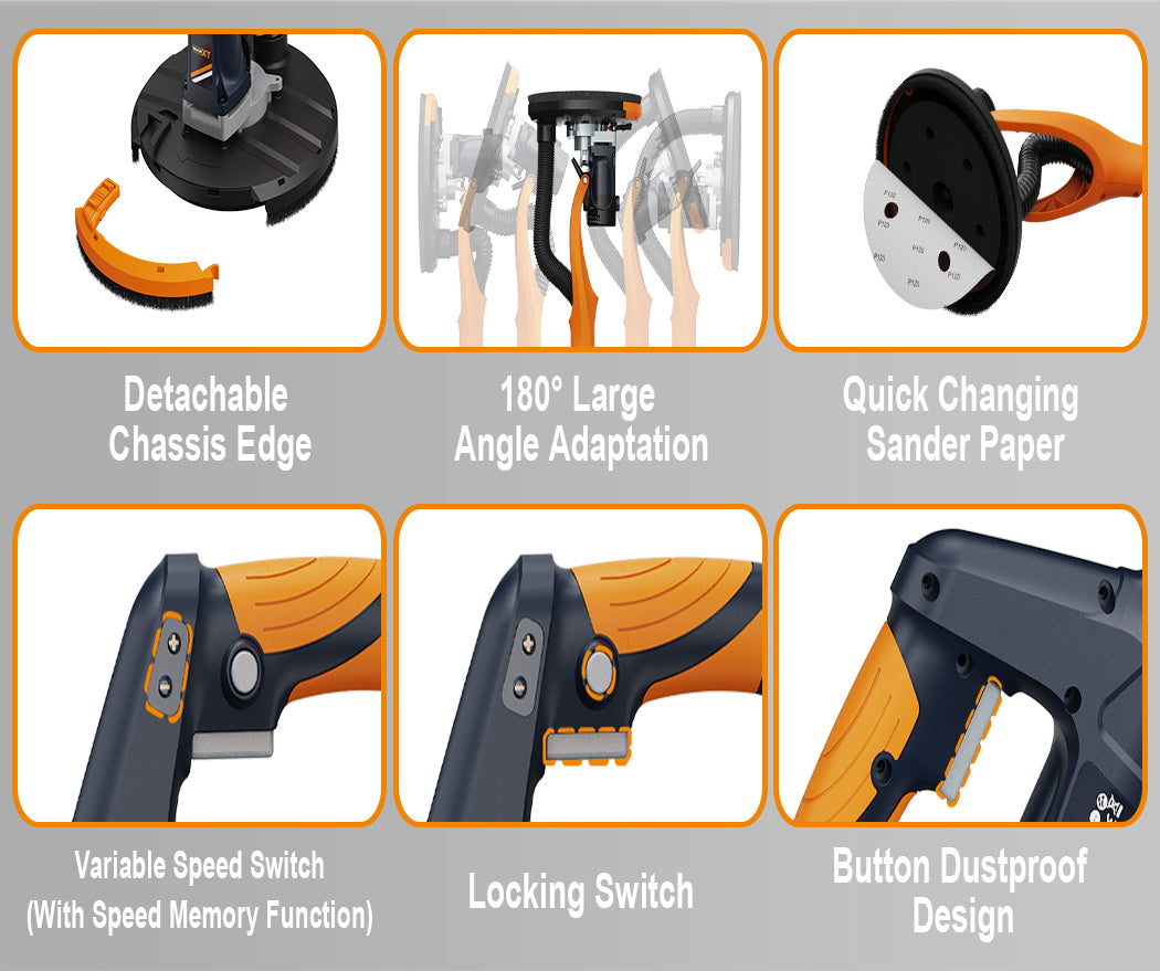 [Powerful Upright Motor] :The upright motor is positioned close to the wall, providing precise pressure control for stable and efficient operation, significantly reducing arm fatigue. The 0°-180° adjustable sanding head with a detachable edge easily handles corner areas, and the spring positioning design ensures even sanding.