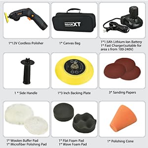 MAXXT Cordless Polisher 12V Mini Buffer Polisher Tool Set Variable Speed 1500mAh Li-ion Battery with Fast Charger and Polishing Pads for Car Detailing and Painted Surface Polishing