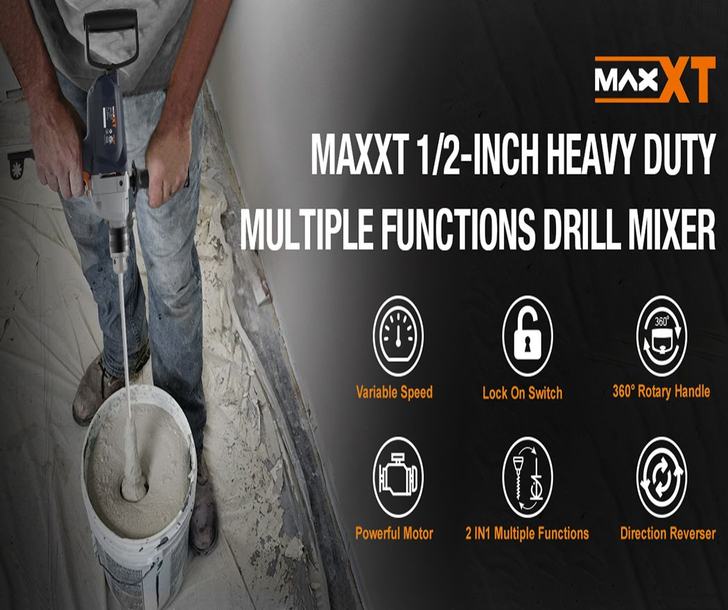 [1/2 Inch Universal Chuck] :Features a 1/2-inch keyless chuck, compatible with various accessories, and can mix a variety of materials including cement, plaster, paint, tile adhesive, and epoxy resin.